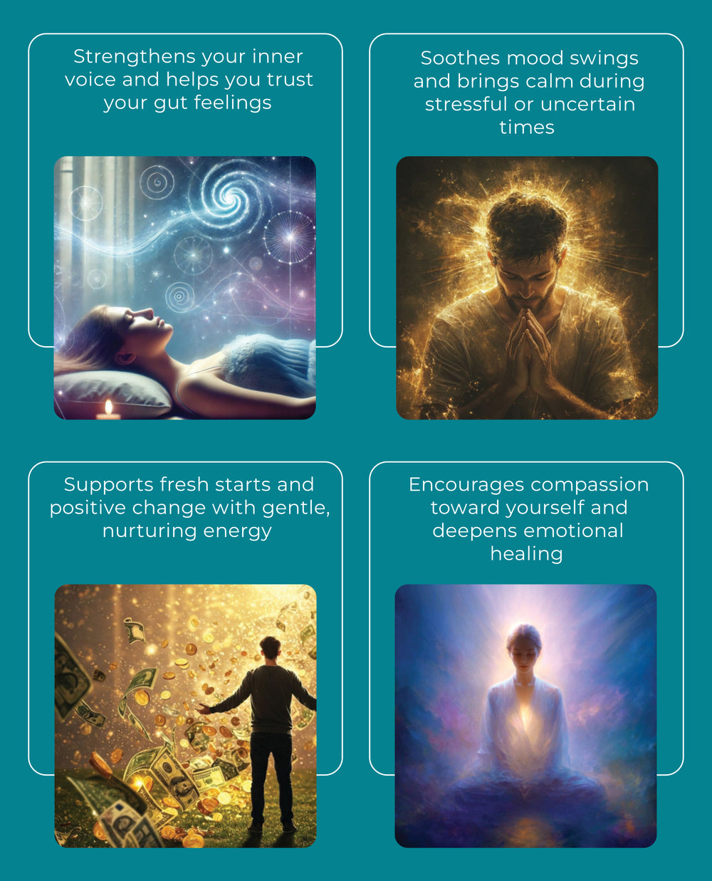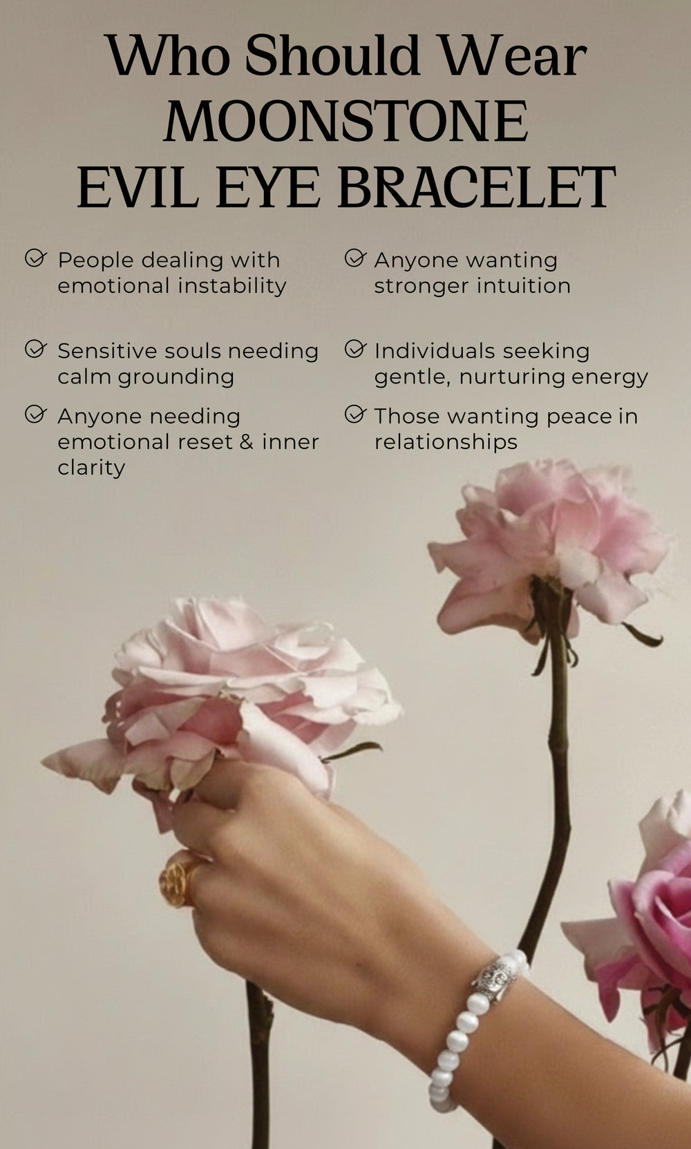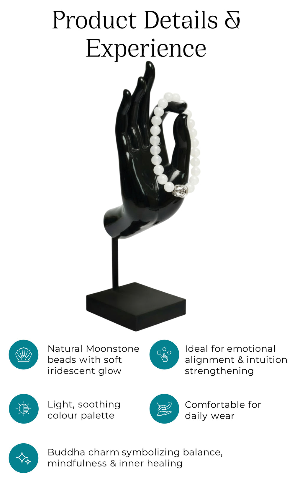 Moonstone is known as the stone of inner flow—bringing emotional balance, intuition and gentle feminine energy. Paired with the Buddha charm, it becomes a symbol of calm awareness and graceful healing.