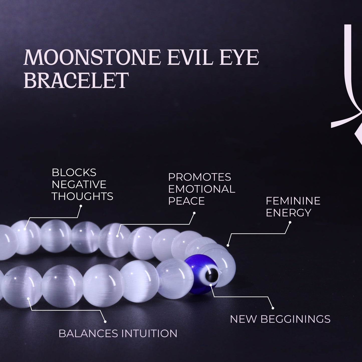 This unique bracelet combines Moonstone’s intuitive and calming energy with the protective symbolism of the Evil Eye. It is designed to shield your emotional field while helping you stay aligned with your inner wisdom.