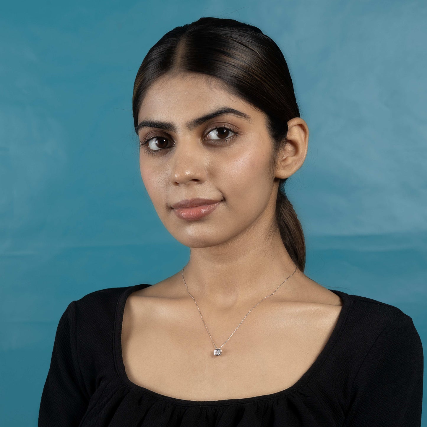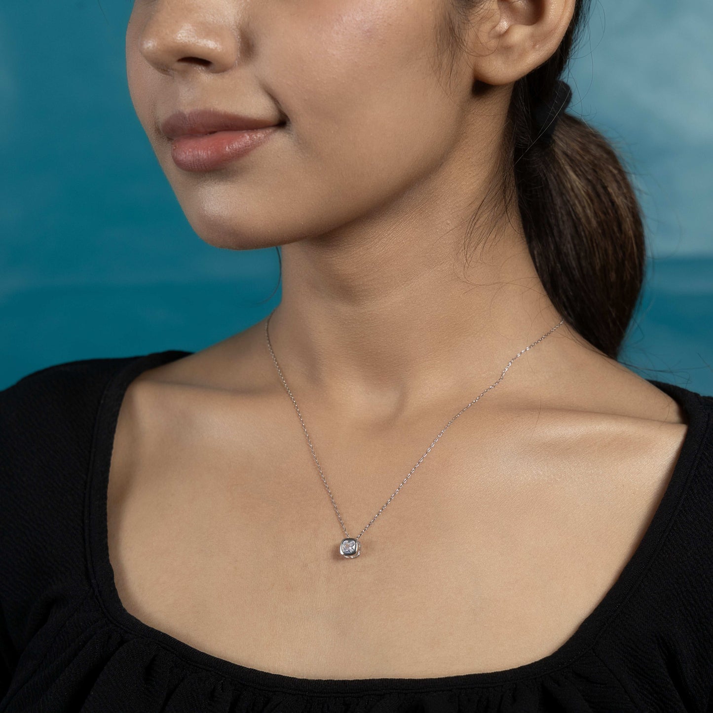 Its delicate chain complements the pendant beautifully, allowing it to sit gracefully on the neckline. The "Square Whisper" pendant is a perfect choice for those who appreciate understated sophistication and want to add a subtle sparkle to their everyday look.